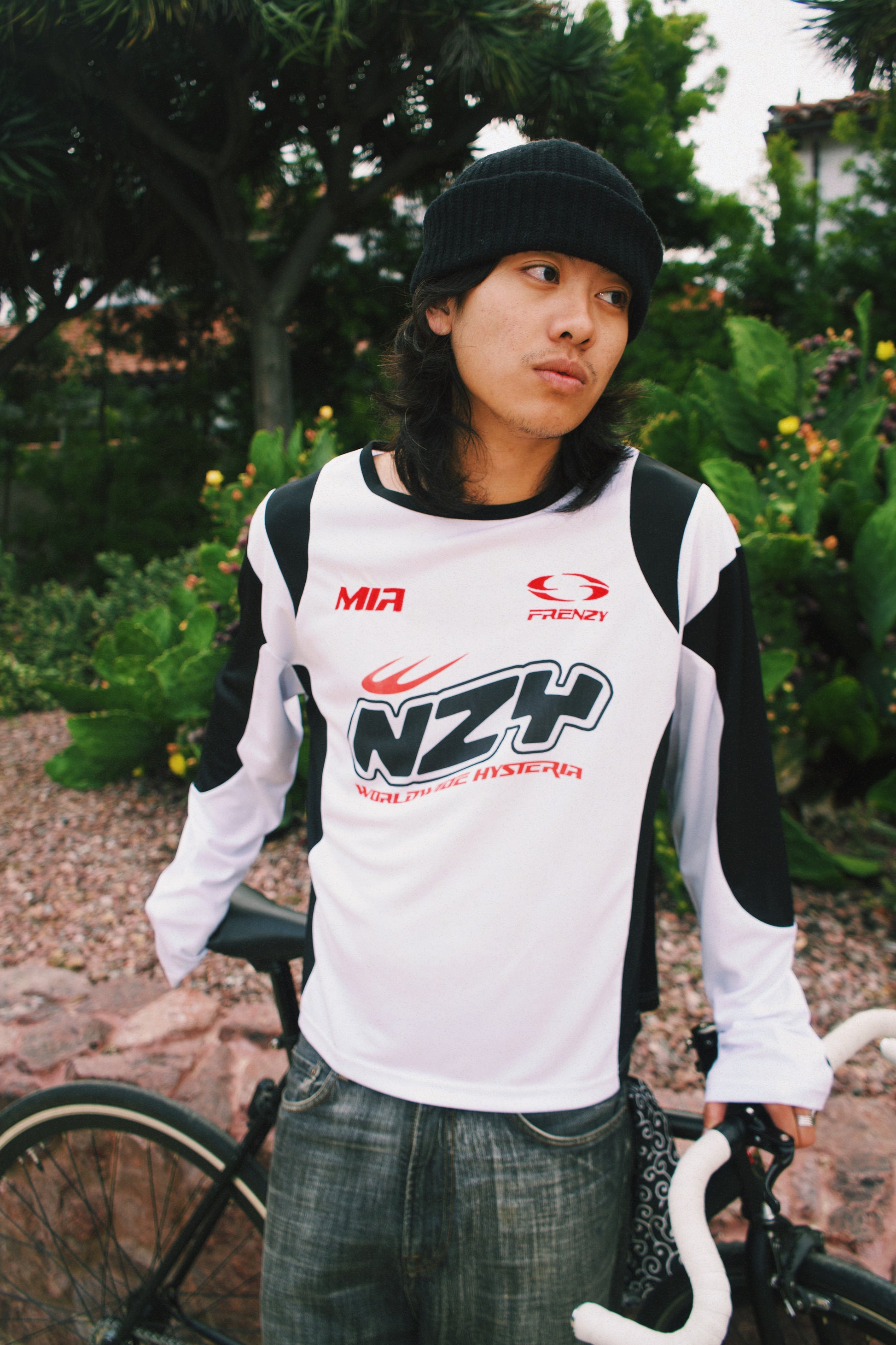 Long sleeve jersey, made from lightweight white mesh material, providing breathability and comfort. It features embroidered logos and bold graphic designs on both the front and back. Oversized.